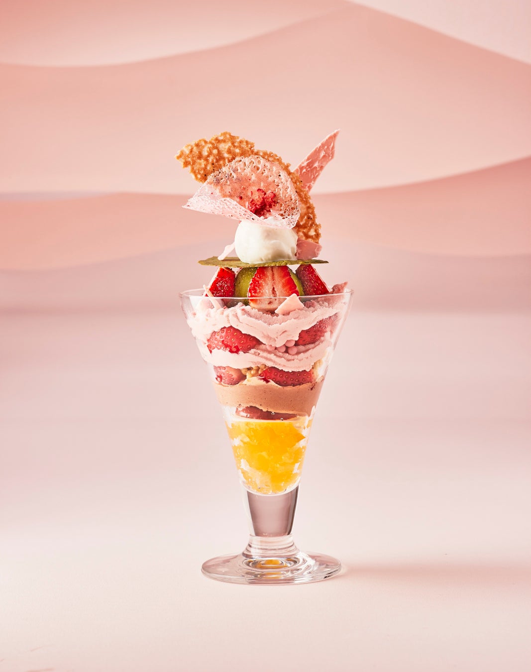 桜に、抹茶、いちご、チョコレートなどを組み合わせた季節限定パフェ。