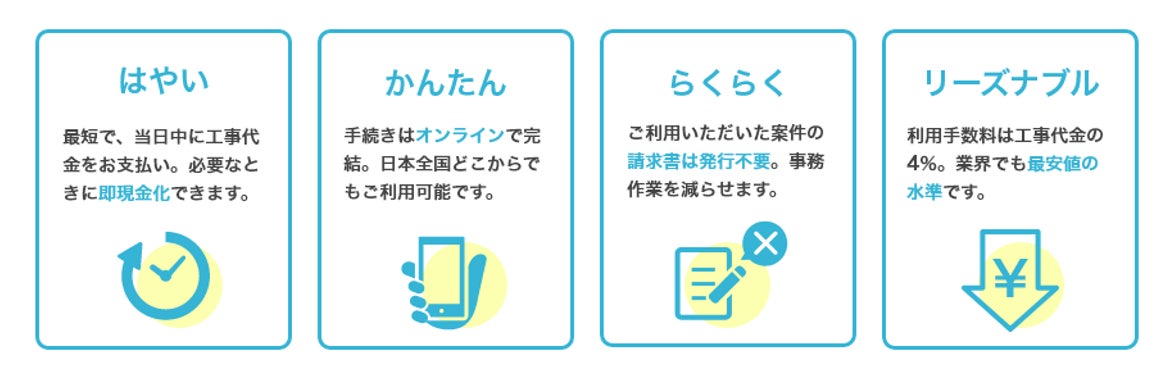 「ヌリカエ先払い」は、ユーザーからの入金より早く、工事代金を受け取ることができる、資金調達サービスです。申請はWebで完結するため、最短で即日入金が可能です。また、請求書の発行も不要で、手数料も業界最安値となります。