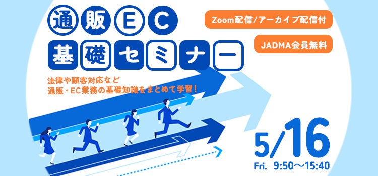 公益社団法人日本通信販売協会(東京都中央区日本橋小舟町3-2リブラビル2階/略称:JADMA)では、今年も法律や顧客対応など通販・EC業務の基礎知識を1日でまとめて学習できる 「通販・EC基礎セミナー」を、5月16日(金)にオンライン開催いたします。