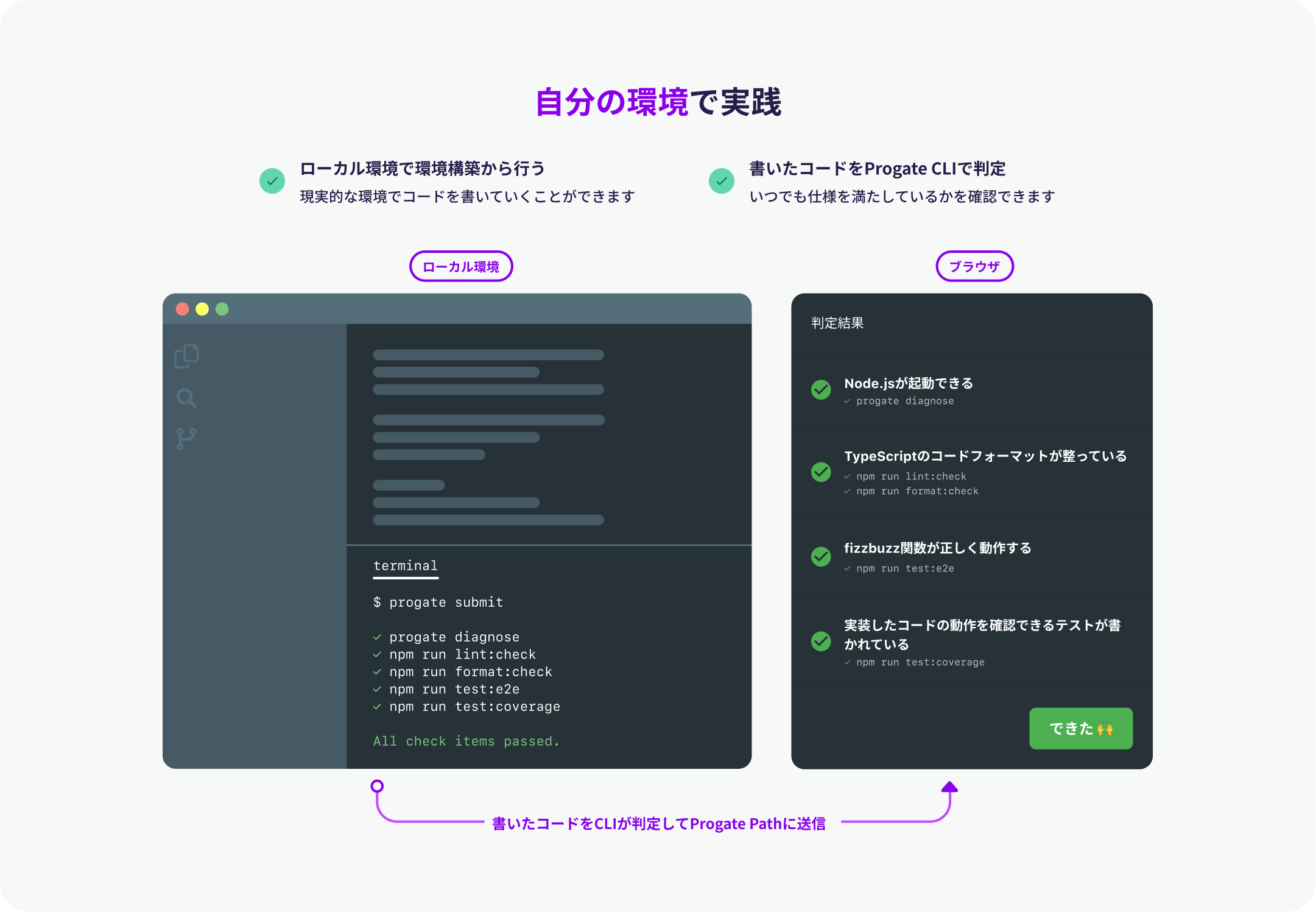 Progate が独自に開発した「Progate CLI」でコードの判定を行うため、ローカル環境でコードを書きながらもブラウザ上で正誤判定を確認することが可能となっています。