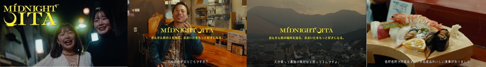 「MIDNIGHT OITA -ミッドナイトおおいた-」は、全八編公開されており、大分県出身のお笑いコンビ ダイノジさん、別府市の「ツーリズム別府大使」も務めるミュージシャンのマーク・パンサーさん、大分県出身であり人気インフルエンサーのきりまるさん、えみ姉さんがミュージックビデオ風の動画に出演。思わず口ずさみたくなる歌にのせて「大分の夜の魅力」を発信しています。また、大分の地元の方には「人」「食」「場所」の視点からその魅力を語っていただき、ドキュメンタリー風の動画を六編制作しました。大分県に訪れた際の“食との出会い”、“思い出の場所との出会い”そして“人との出会い”のヒントとなれば幸いです。