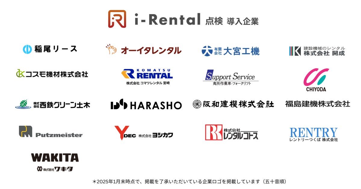 導入企業の一部:稲尾リース株式会社、オーイタレンタル株式会社、有限会社大宮工機、株式会社開成、コスモ機材株式会社、株式会社コマツレンタル宮崎、株式会社サポートサービス、千代田機電株式会社、株式会社西鉄グリーン土木、株式会社原商、阪和建機株式会社、福島建機株式会社、プツマイスタージャパン株式会社、株式会社ヨシカワ、株式会社レンタルコトス、レントリーつくば株式会社、株式会社ワキタ