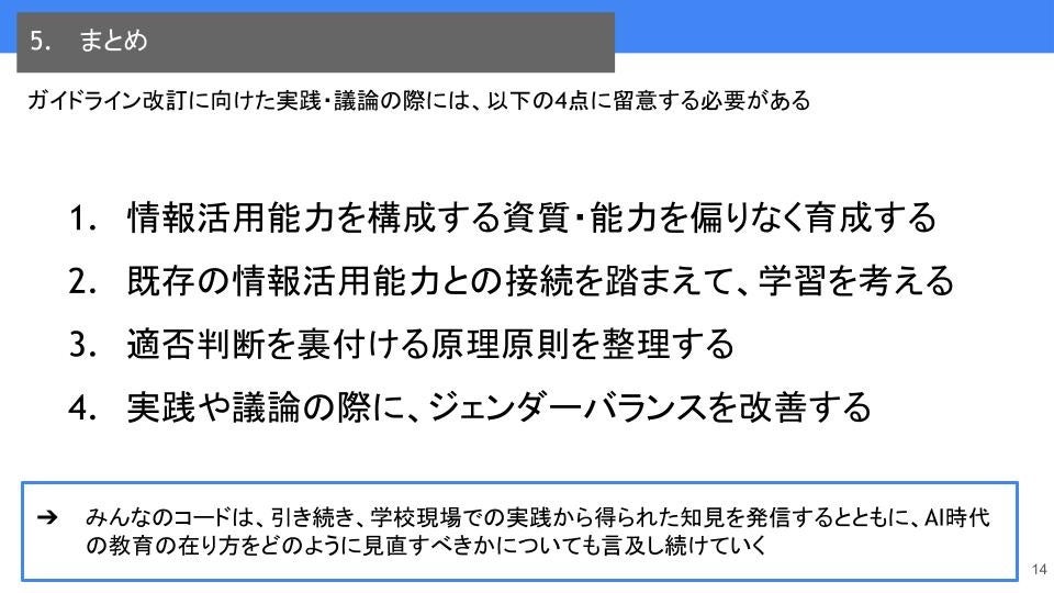 そこで、みんなのコードが6月までに行った学校現場で得られた知見をもとに、今後のガイドライン改訂に向けて実践・議論の際に留意すべきポイントを4つに整理しました。これらをまとめた提言資料「『初等中等教育段階における生成AIの利用に関する暫定的なガイドライン』への見解」を発表します。