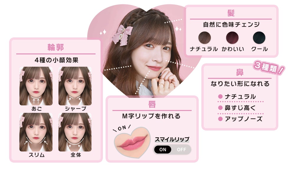 「全体盛り」パレットでは、「輪郭」「鼻」「唇」「髪」と顔周り全ての部分を調整できて自分にピッタリな盛りに!「メイク」パレットでは前回も人気だった「盛り薄く」機能があるので、推しと一緒に写るときも安心。さらに、人気のスマイルリップも!