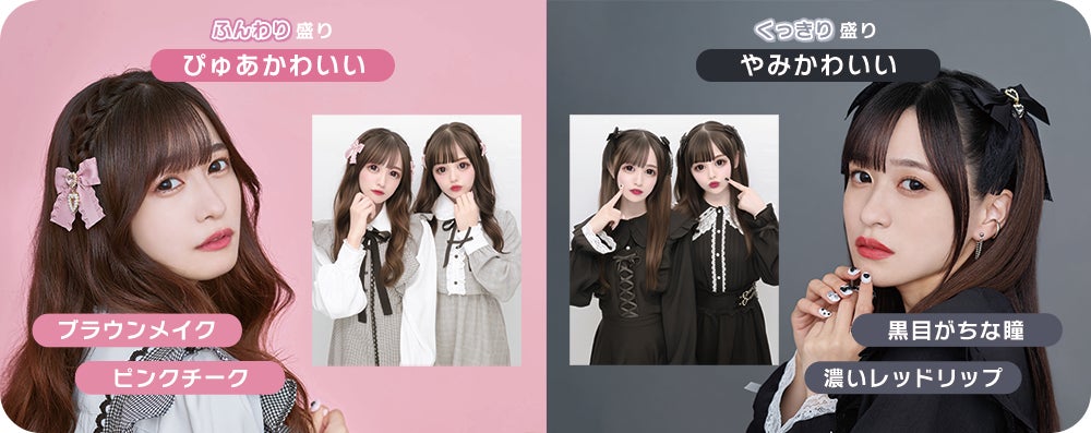 「ぴゅあかわいい」コースはブラウンアイメイクとぽっと色付くピンクチークで、ふんわりとした写りに、「やみかわいい」コースは黒目がちな瞳と、濃いレッドリップでくっきりとした写りに。好みや気分に合わせて選べる2種類の盛りが楽しめます。