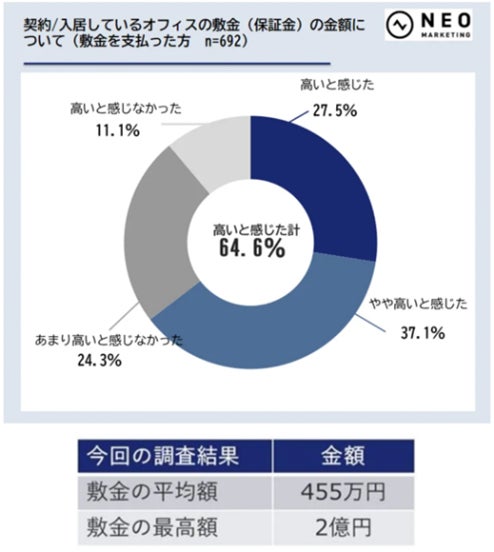 「全国の企業経営者・経営層1,000名に聴いた「コロナ禍でのオフィス利用と企業経営に関する調査」」では、敷金の平均額は455万円で、中には2億円も支払っている企業がいることがわかりました。経営者の64.6%が「敷金は高い」と感じつつ、49.6%が「取られて当然」という考えを持っています。また、原状回復費用や償却分以外は返却される敷金ですが、返ってこないものだと考えている人が38% にのぼります。