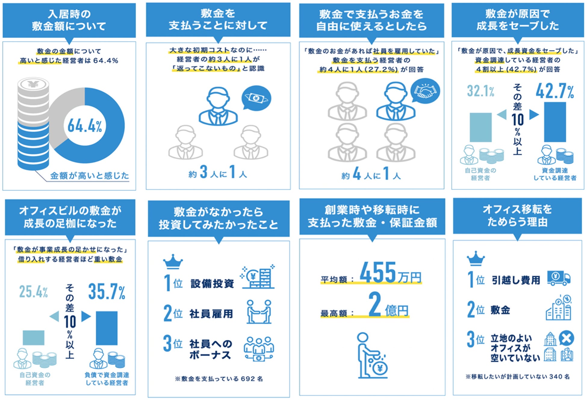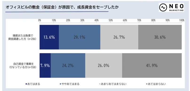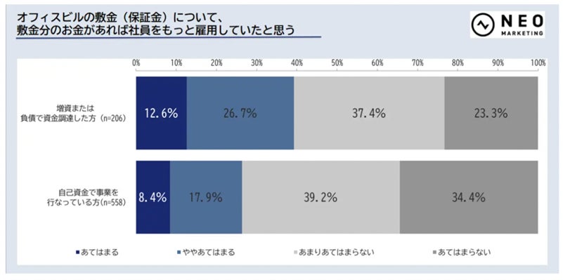 敷金について、資金調達を行なった経営者の45.6%が「そのお金があれば成長できていたと思う」と回答しました。反対に、自己資金で事業を行なっている経営者では31.0%と、資金調達を行った経営者のほうが、敷金を本来なら事業成長に活かせる資金だと捉えています。また、資金調達を行なった経営者の39.3%が 「そのお金があれば社員をもっと雇用していたと思う」と回答、さらに42.7%が「敷金が原因で成長資金をセーブした」と回答しました。この結果から敷金が企業成長の足枷になっていることが浮き彫りとなりました。