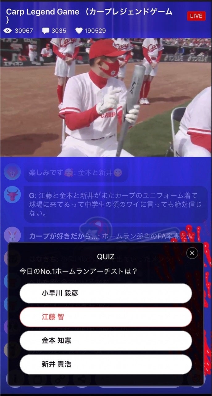株式会社LivePark(東京都港区、代表取締役社長:安藤 聖泰)は、広島テレビアプリによる「Carp Legend Game」のインタラクティブ配信をサポートしました。「Carp Legend Game」の模様は、広島テレビによる放送(14時55分〜17時53分)に加え、広島テレビアプリを通じてインタラクティブライブ配信(14時00分~17時51分)し、全国のカープファンに届けました。今回、広島テレビに寄せられたご意見なども踏まえ、本配信の結果報告を発表いたします。