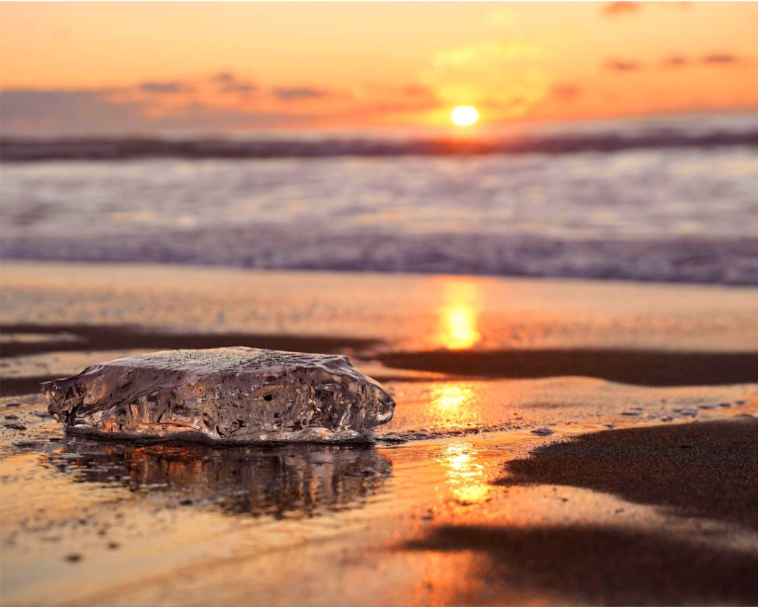 海岸に広がるまるで宝石のように輝く「ジュエリーアイス」。十勝川でつくられた氷が太平洋に流れ出て、海岸に打ち上げられたものです。流氷とも異なるその美しさは、ここでしか見ることのできない絶景です。