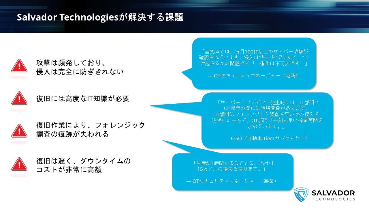 日本市場においては、株式会社テリロジーが昨年10月より販売を本格化しており、Salvador Technologies社と共にOTシステムの迅速な復旧を必要とするお客様に向け、パートナーと協力した提案活動を展開しています。