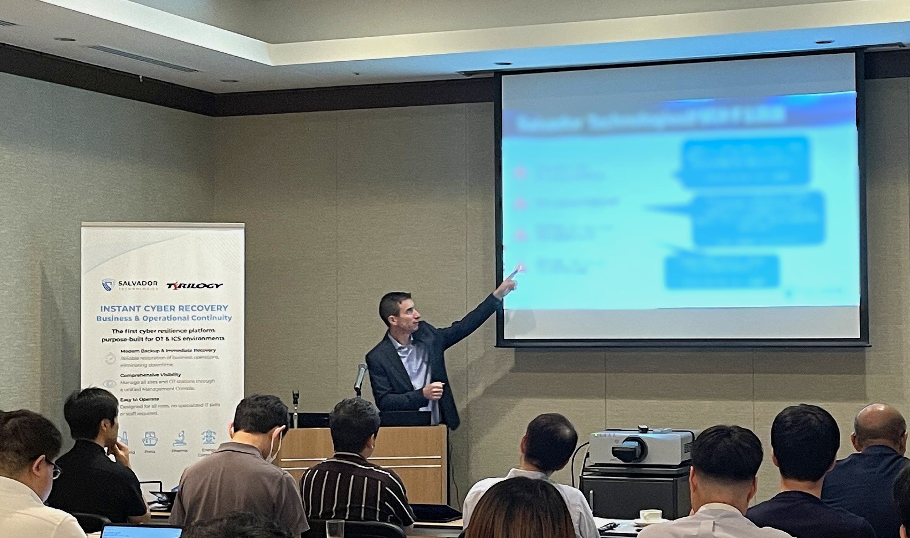 講演では、Salvador Technologies社がこれまで培ってきたグローバルでの実績、実際の導入事例、さらに今後リリースを予定している新機能について紹介しました。Salvador Technologies社はOT環境に特化したバックアップ・リカバリーソリューションを提供するサイバーセキュリティベンダーであり、インシデント発生時にはわずか30秒ほどでシステム復旧を実現する強みを持っています。