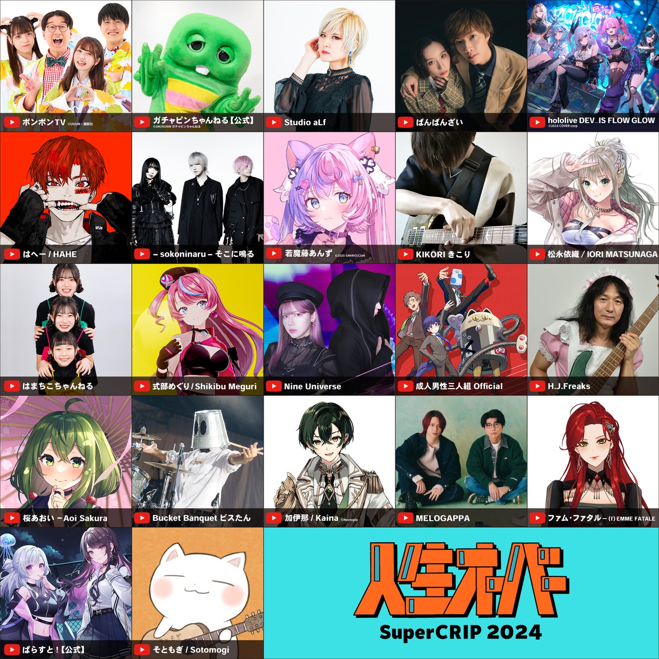 2回目の開催となる「Super CRIP 2024」では、前回を上回る22組の人気クリエイターの参加が決定いたしました。YouTuber・VTuberはもちろんのこと、ミュージシャン・海外歌い手まで幅広いジャンルのクリエイターが参加します。