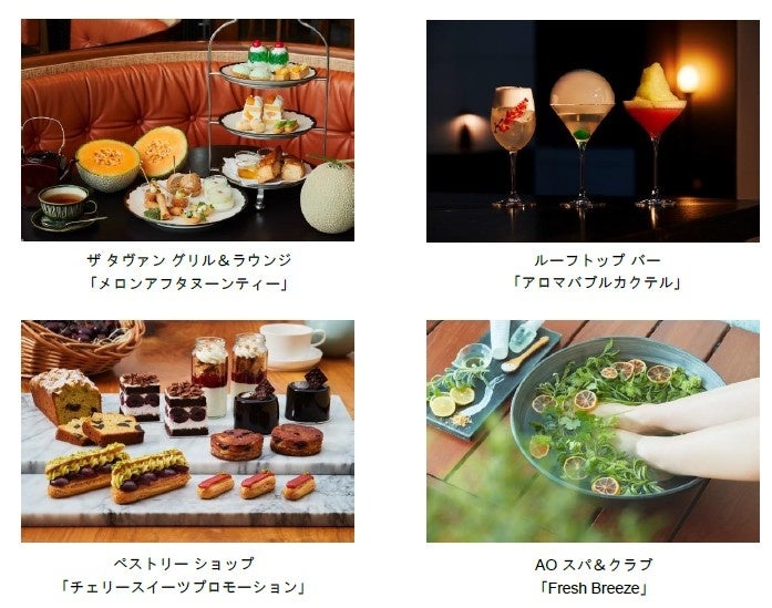 「ザ タヴァン グリル&ラウンジ」では、初夏に旬を迎える人気のフルーツ「メロン」をテーマにした、彩りも鮮やかなアフタヌーンティーを、「ルーフトップ バー」では、味覚、視覚、嗅覚でお楽しみいただける“Bubble(泡)”とティーフレーバーを組み合わせた3種類のユニークなカクテルをご用意いたします。「ペストリー ショップ」では、甘みが強い国産のさくらんぼ「紅秀峰」やアメリカンチェリーを贅沢に使用したスイーツが登場。「AO スパ&クラブ」では、本格的な暑さが到来する前に、心身ともにリフレッシュでき、梅雨の時期特有の肌荒れもケアできる季節限定メニューをご用意し、皆さまをお迎えいたします。