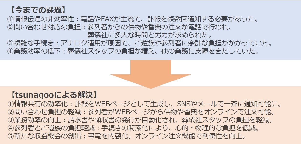 「tsunagoo」は、従来の電話やFAX中心の運用からデジタル化への移行を促し、ご遺族や参列者、葬儀社すべての負担軽減に寄与してまいります。