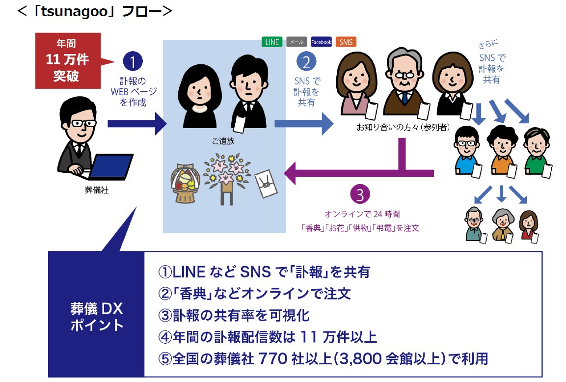 訃報配信・香典サービス「tsunagoo(つなぐ)」WEB訃報配信年間11万件突破!業界を牽引する実績
