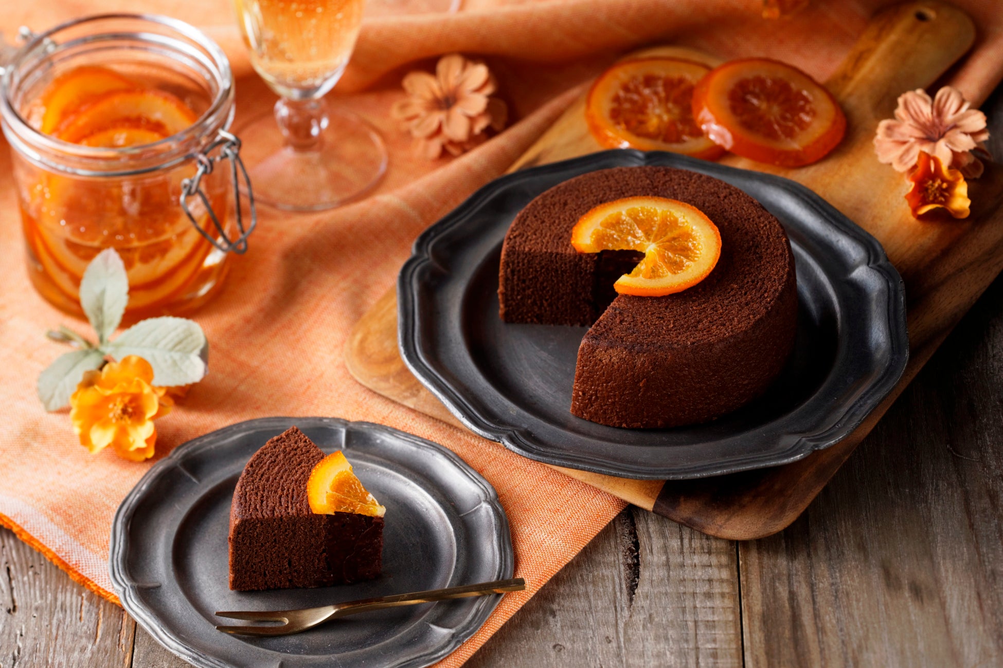■概要:ふんわりとしたショコラバウムクーヘンの中央に、ベルガモットやオレンジの香りと酸味を加えたチョコレートクリームを入れ、オレンジスライスを上に飾りました。甘さは控えめに、ほろ苦さと酸味を効かせた、ちょっと大人のバウムクーヘンです。