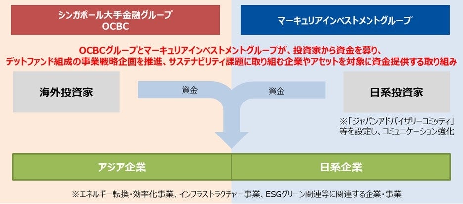 株式会社マーキュリアホールディングス(以下、「当社」といいます。)は、シンガポールに本社を持ち東南アジア2位の資産規模を誇る金融サービスグループのOVERSEAS-CHINESE BANKING CORPORATION LIMITED(以下、「OCBC」といいます。)とASEANサステナビリティをテーマとするクレジットファンドの創設に向け、ビジネス上の協業を図るための覚書を締結致しました。当該クレジットファンドは、脱炭素化を含むアジア圏のサステナビリティ向上への寄与が期待されるプロジェクトやビジネスを投融資の対象とする方針です。当社グループは2005年の設立以来、「クロスボーダー」をコンセプトに、時々のマクロ環境に応じた投資を戦略的に展開しており、上記ファンド事業に加え、当該ファンドに関わる日本やアジアの企業、そしてOCBCおよび当社を含めた交流プラットフォームを提供することで、日本やアジア諸国における新たなビジネスの創出・促進を構想しております。OCBCと当社は、当該ファンドビジネスおよび交流プラットフォームを通じて、日本とASEANを含むエコシステムの強化の一助となることを目指します。