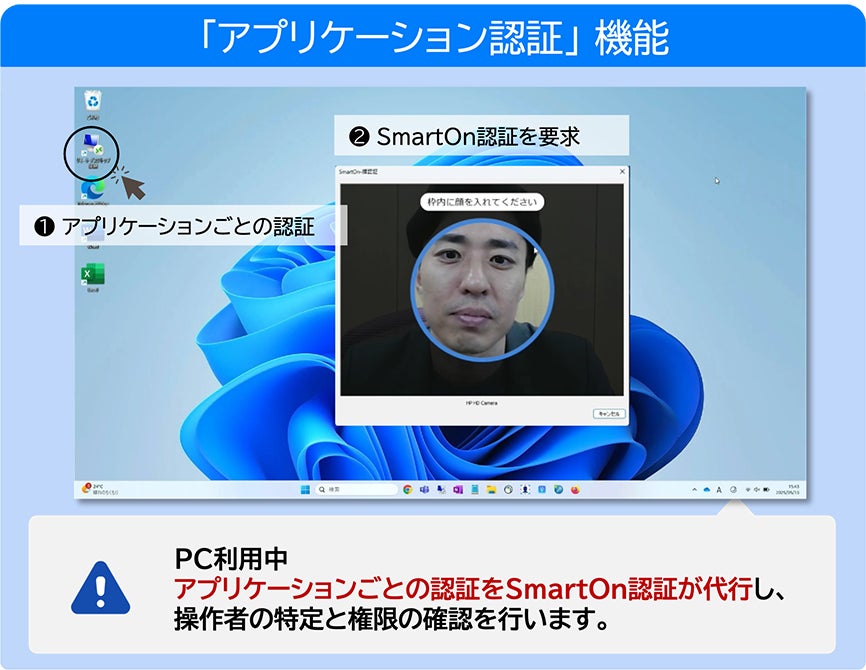SmartOn IDの新バージョンでは、この課題を解決するため、新たに「アプリケーション認証」機能を搭載しました。本機能により、PCへのログオン状態を維持したまま、特定の業務アプリケーションが求める認証を、SmartOnによる認証(顔認証、ICカードなど多様な認証方式に対応)が代行します。