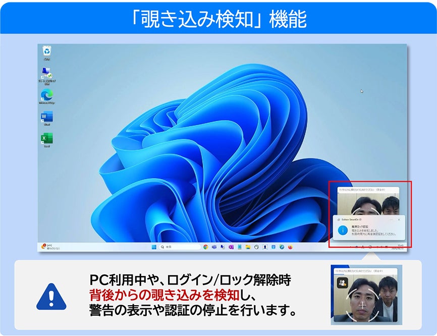 PC内蔵または外付けのWebカメラを利用し、PC利用者の背後からの覗き込みを定期的に検知します。 複数人の顔を検出した際に、警告表示または自動ロックを実行することで、情報漏洩を未然に防ぎます。