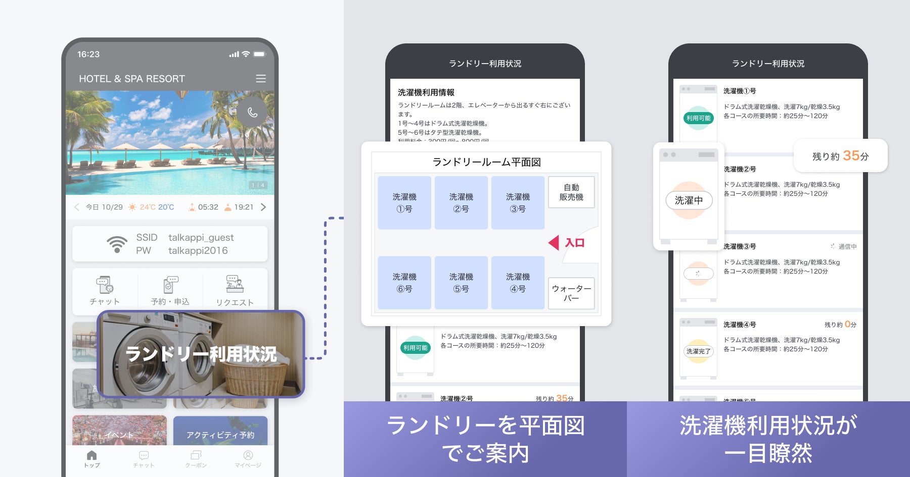 ゲストは、旅ナカアプリ「VERY」を通じてランドリーの空き状況や使用状況をスマートフォンで簡単に確認できます。客室はもちろん、レストランやロビー、売店など、施設内のどこからでも利用状況を把握できるため、待ち時間を短縮し、滞在中の時間を有効に活用できます。