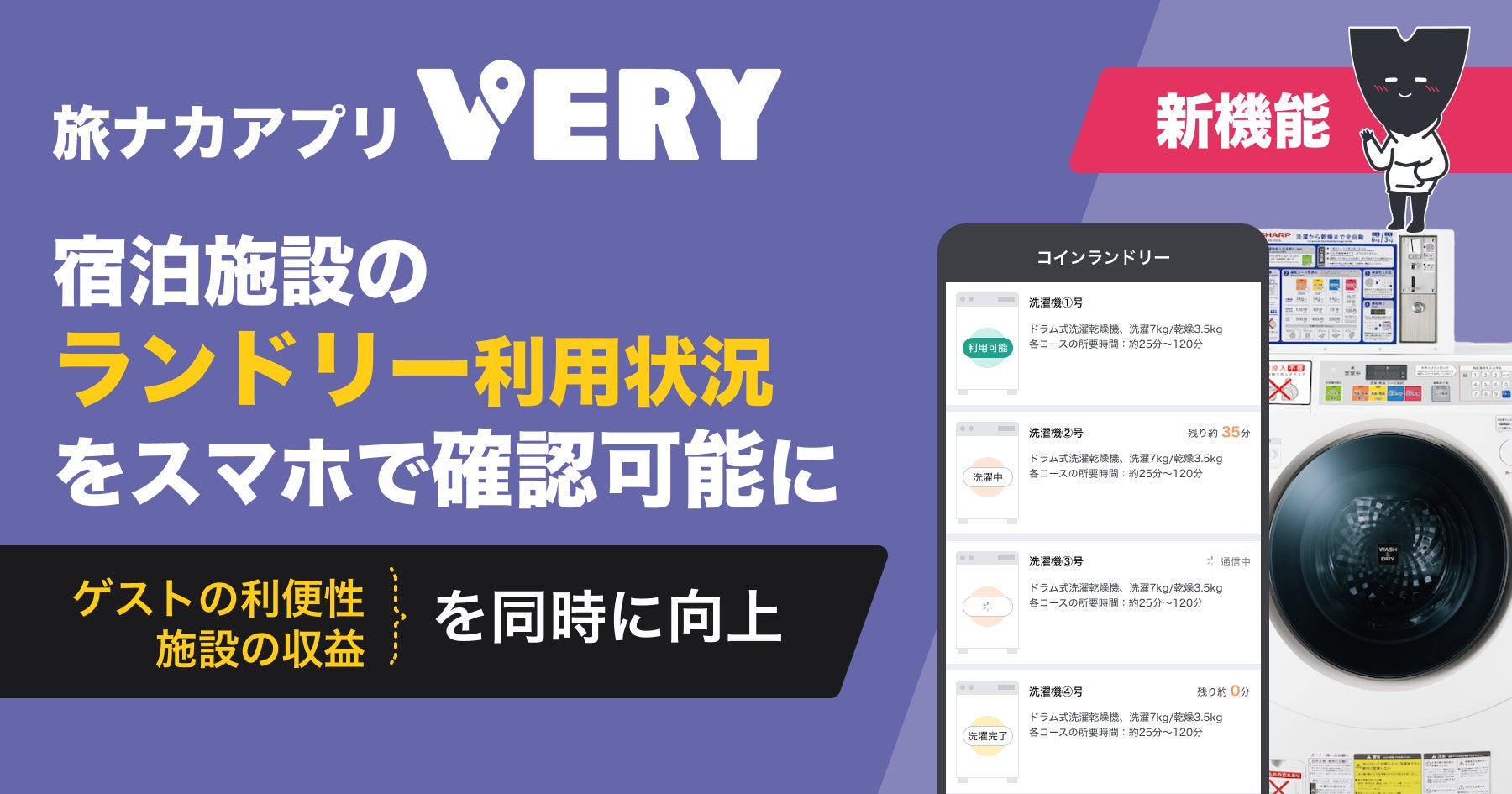 旅ナカアプリ「VERY」に新機能!宿泊施設のランドリー利用状況をスマホで確認可能に、ゲストの利便性と施設の収益を同時に向上