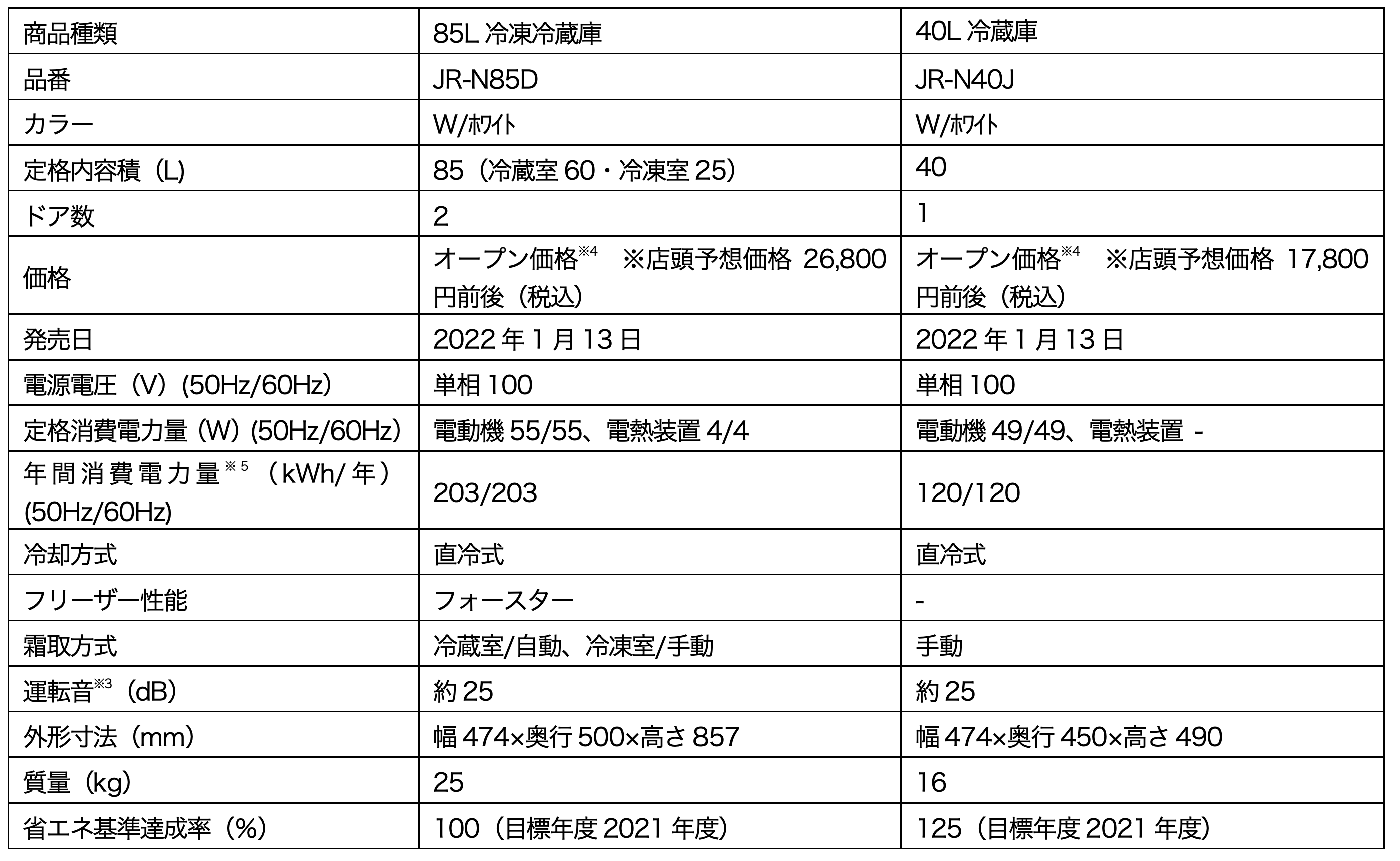 85L冷凍冷蔵庫(JR-N85D)・40L冷蔵庫(JR-N40J)の概要は以下の通りです。