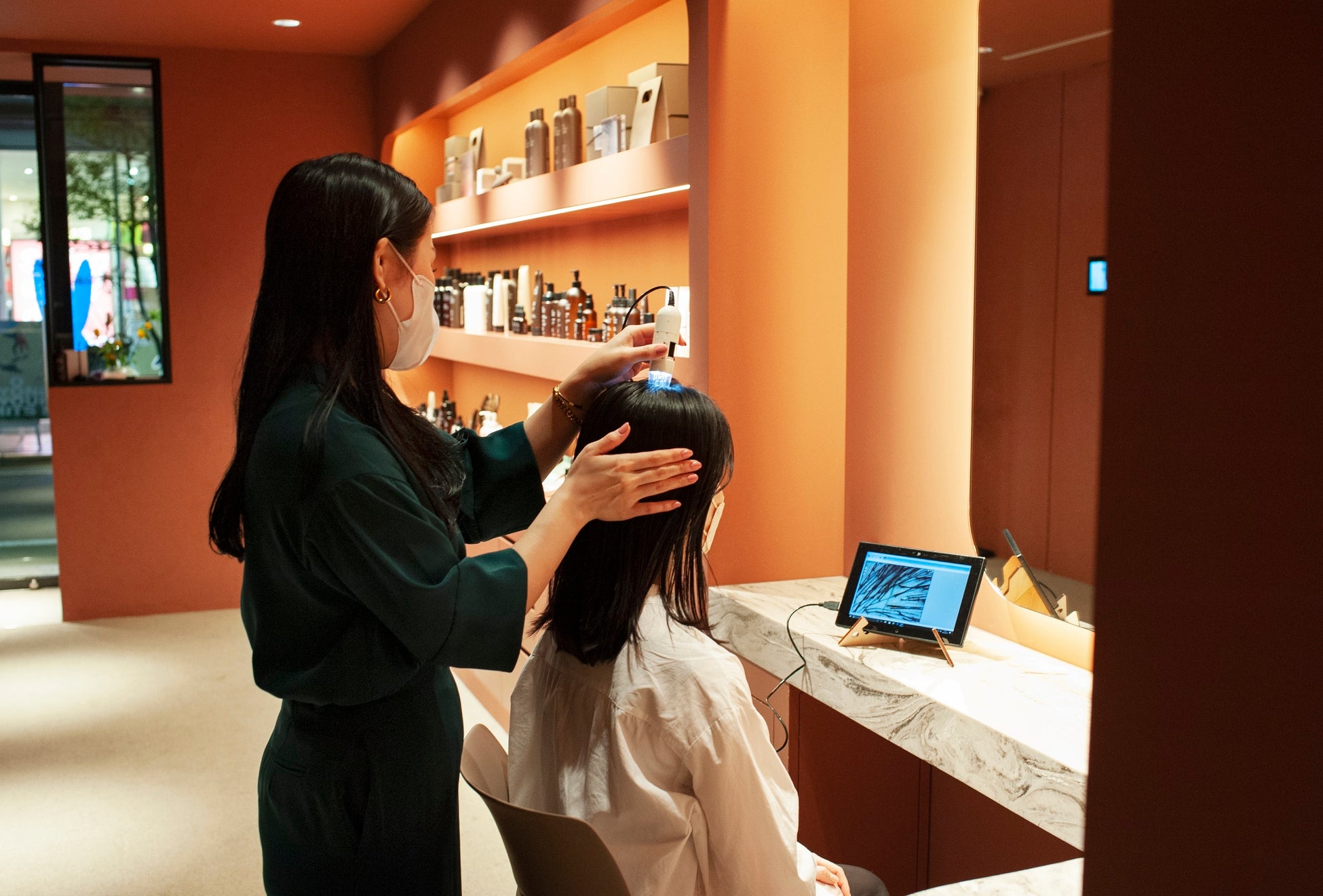 約230倍まで拡大ができる高解像度のマイクロスコープを使い、頭頂部、側頭部、後頭部の3点を確認し、状態の違いから普段の洗髪時のクセやライフスタイルにより受けやすいダメージなどを把握し、なりたい仕上がりに合わせて、香り豊かな商品を紹介します。