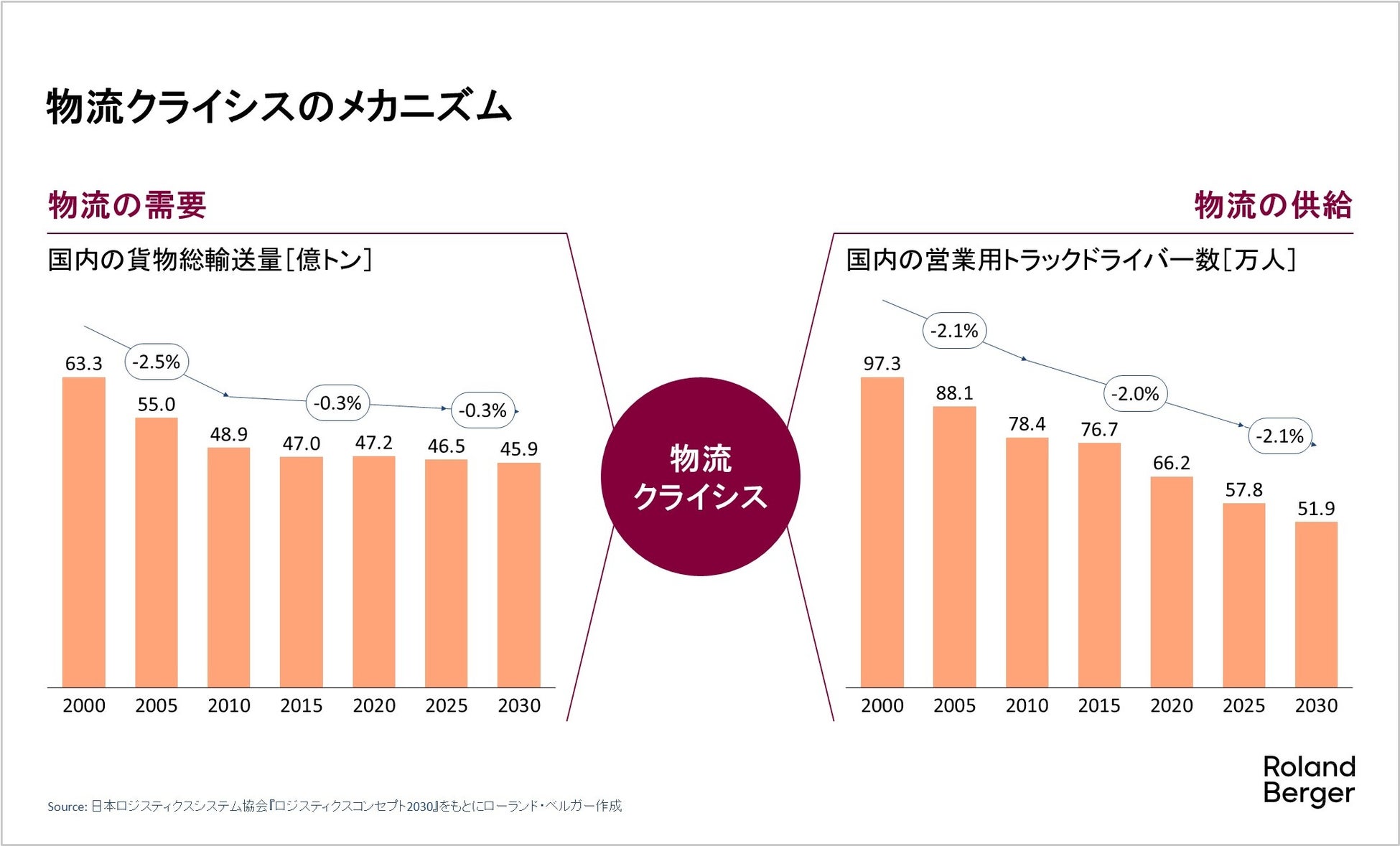 産業や生活を支える物流が、危機に直面しています。国内の貨物総輸送量はほぼ横ばいである一方で、営業用トラックのドライバーは年率2%超で減少しており、今後も歯止めはかかる見込みがないためです。担い手の不足に起因する物流危機のさらなる深刻化は避けられないでしょう。