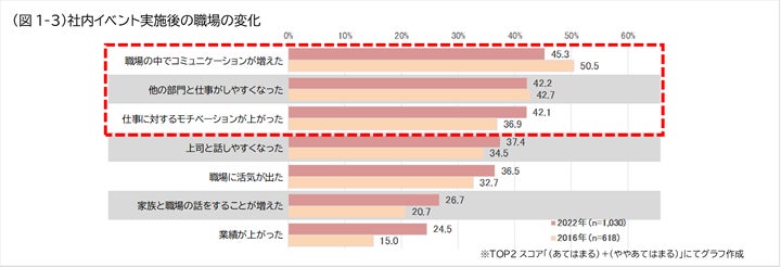 1-3.社内イベントの効果は、1位「職場の中でコミュニケーションが増えた」、2位「他の部門と仕事がしやすくなった」、