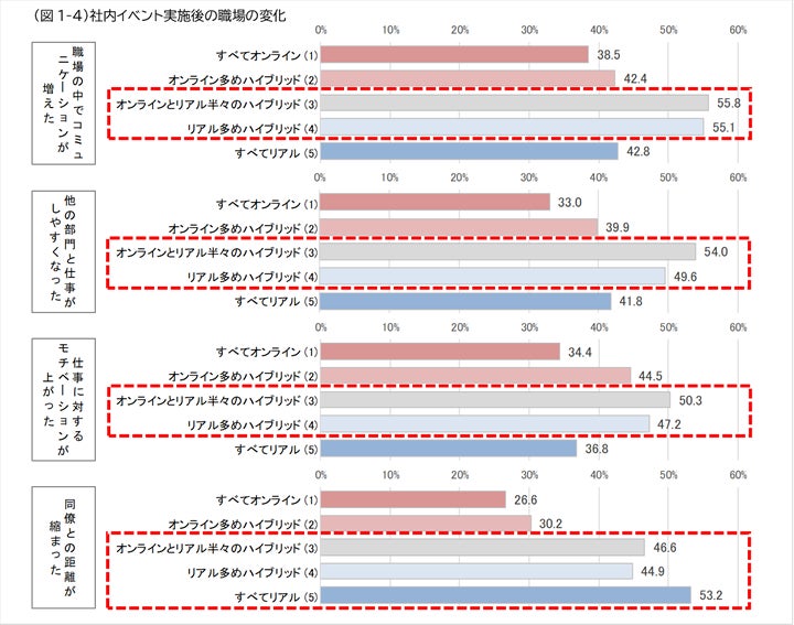 社内イベント実施後の職場の変化について、開催方法別にみたところ、「職場の中でコミュニケーションが増えた」、「他の部門と仕事がしやすくなった」、「仕事に対するモチベーションが上がった」などはいずれも、オンラインとリアル半々、リアル多めハイブリッドで高い効果が得られたことがわかりました。 また、「同僚との距離が縮まった」では、リアルの比率が高いほど効果的であることもわかりました。一方で、「すべてオンライン」の開催方法は相対的に評価が低いことから、リアルでの参加の必要性も重要であることがわかります。(図1‐4)