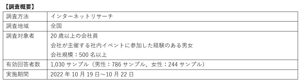 本調査では、コロナ禍以降に社内イベント(会社が主催する会議、表彰式、パーティー、運動会、周年記念イベント)に参加した人にアンケート調査を行い、2016年に調査したコロナ禍以前のデータと比較して、現代の社内イベントの効果や成功要因・失敗要因を明らかにしました。