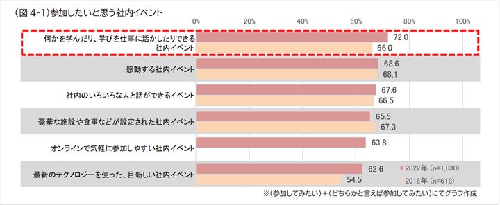 参加したいと思う社内イベントについて聞いたところ、「何かを学んだり、学びを仕事に活かしたりできる社内イベント」(72%)が最も多く、次に「感動する社内イベント」(69%)、「社内のいろいろな人と話ができるイベント」(68%)、「豪華な施設や食事などが設定された社内イベント」(66%)、が、ほぼ同じ割合で選ばれました。(図4-1)