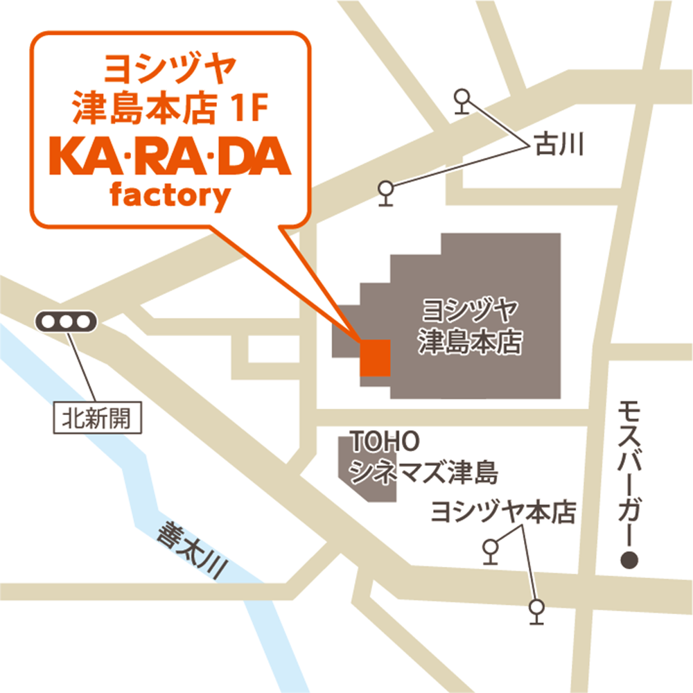 この度、出店するヨシヅヤ津島本店は、愛知県を中心に29店舗を展開する、地域密着にとことんこだわる総合ショッピングセンターの「ヨシヅヤ」の旗艦となる「津島本店」です。当店「カラダファクトリー」は、1階のフロアにグランドオープンいたします。お仕事やお買い物の際、ぜひお気軽にお立ち寄りください。