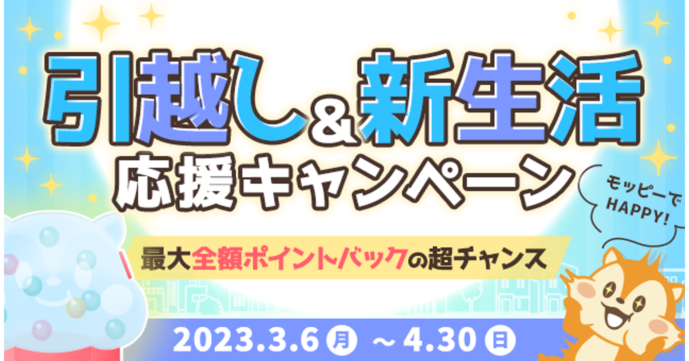 ポイントサイト「モッピー」では、少しでも皆さまの家計の負担を軽減するため、春の大出費である引越しや新生活の準備がまとめてお得になる「モッピーでHAPPY!引越し&新生活応援キャンペーン!」をご用意しました。