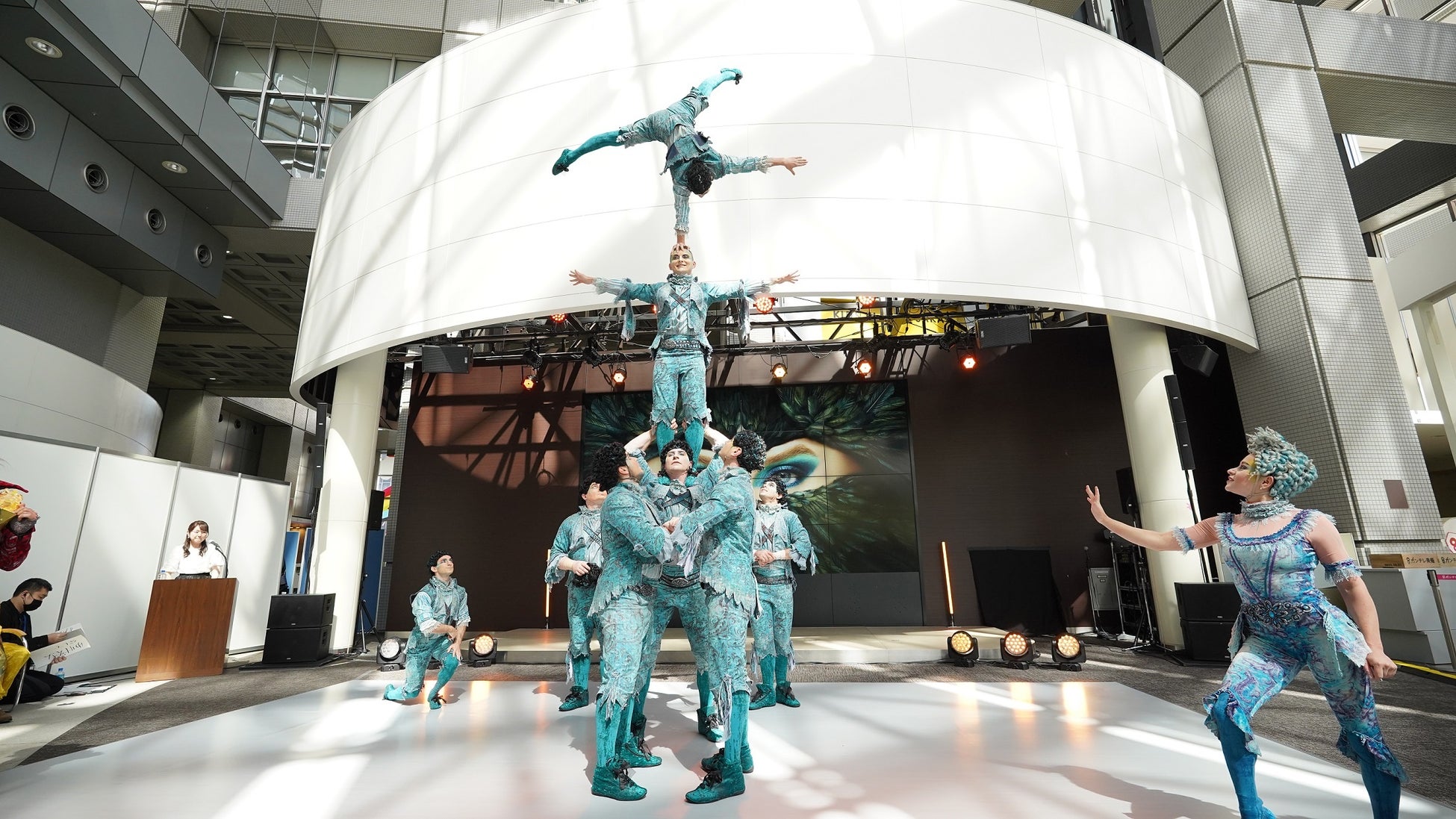 パフォーマンス後には、公演を主催する関西テレビ放送の羽牟正一代表取締役社長より、「コロナ禍の影響もあり、5年の月日を経て、日本公演を実現することになりました。シルク・ドゥ・ソレイユはファンが多く、小さいお子様から高齢者まで幅広い方々にご支持、期待されていて、楽しんでいただける演目になっています。世界的最高のパフォーマンスを大阪で見ていただき、一人でも大勢の方々にご来場いただいて、感動と歓喜と興奮を味わっていただければ」と今回の公演にかける思いとともに挨拶しました。