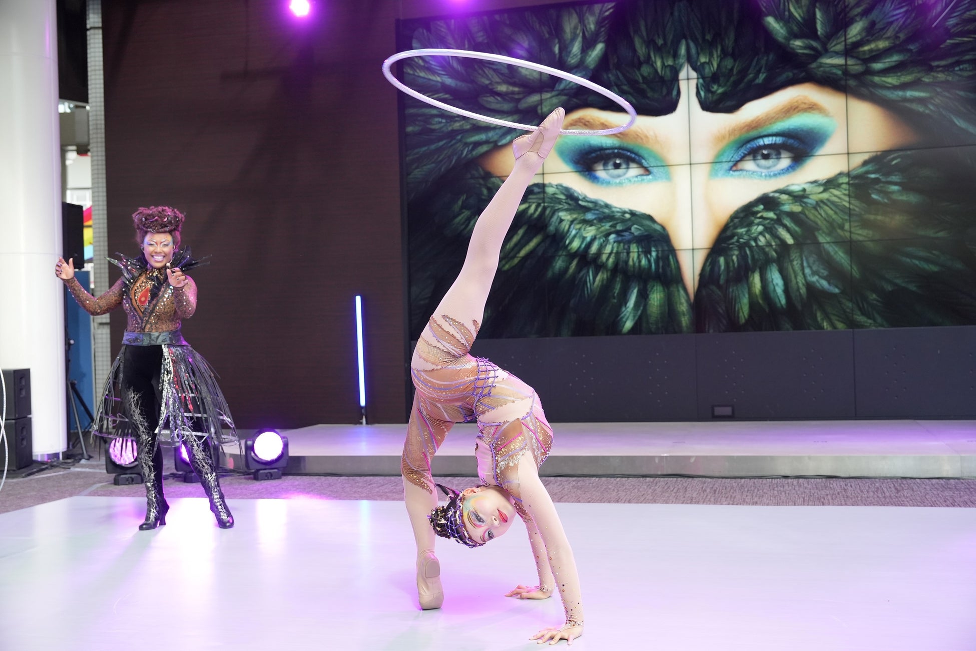 記者発表の冒頭では演目”フラフープ”を披露。アーティストがステージに颯爽と現れ、ステージ上でMr.フルールとシンガーを伴って”フラフープ“のパフォーマンスがスタート。シンガーの歌に合わせて繰り広げられる超人技で客席を魅了しました。