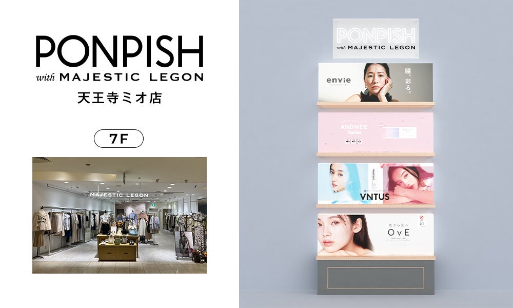 アパレル業界の老舗ブランド「MAJESTIC LEGON」とタッグを組み、2024年1月に新宿ミロード店、同年2月にラフォーレ原宿店にカラーコンタクトレンズの売場展開をスタート。6月5日(水)には第3号店として天王寺ミオ店にオープン。今後も両社の強みであるアパレル販売のノウハウと「PONPISH」の品揃えを活かし、新たな顧客満足度向上の可能性に挑戦致します。