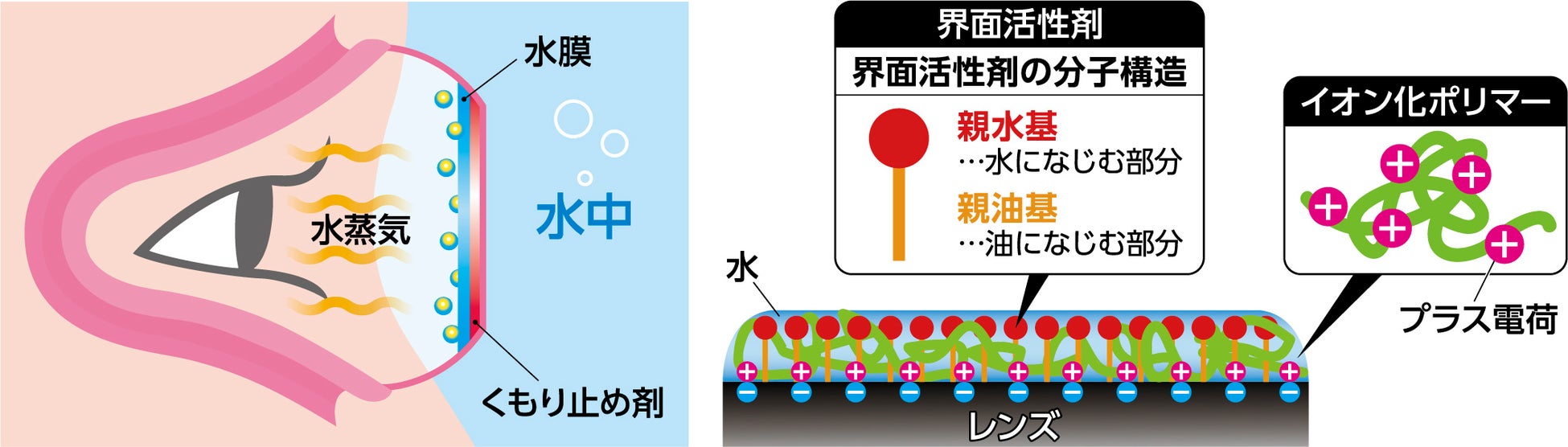 『クリアクア スイミングゴーグル用くもり止めジェル』は親水作用を持つ界面活性剤に加えて「イオン化ポリマー」を配合。プラス電荷をもつイオン化ポリマーが、植物由来の界面活性剤をからめながらレンズ表面に強固な親水膜を形成することにより、レンズ内側のくもりを長時間防ぎ、快適なスイミングをお楽しみいただけます。