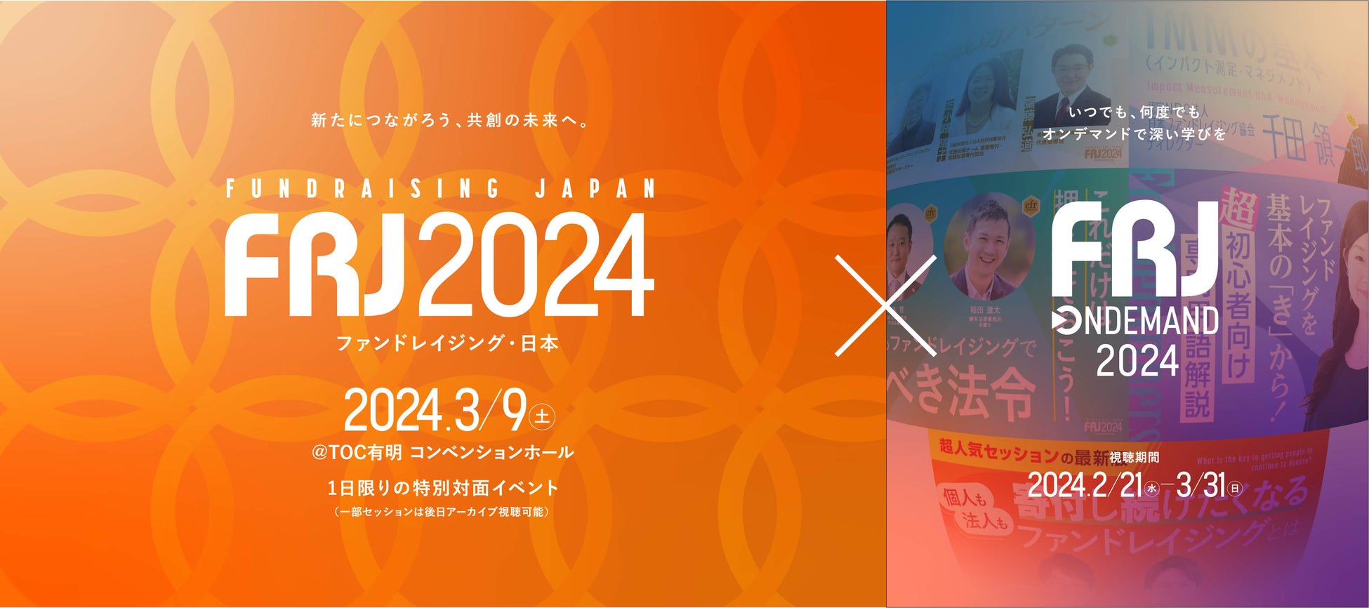 ●FRJ2024について FRJ2024は、NPO/NGOはじめ、 企業、大学、行政、財団などで社会課題解決に立ち向かうプレイヤーが 1000人規模で集う、日本最大のファンドレイジングカンファレンスです。 14回目の開催となる今回は、リアルとオンラインを駆使して、寄付やファンドレイジングの最新動向や実務にすぐに役立つスキルを学べるセッションを40日間にわたりお届けします。