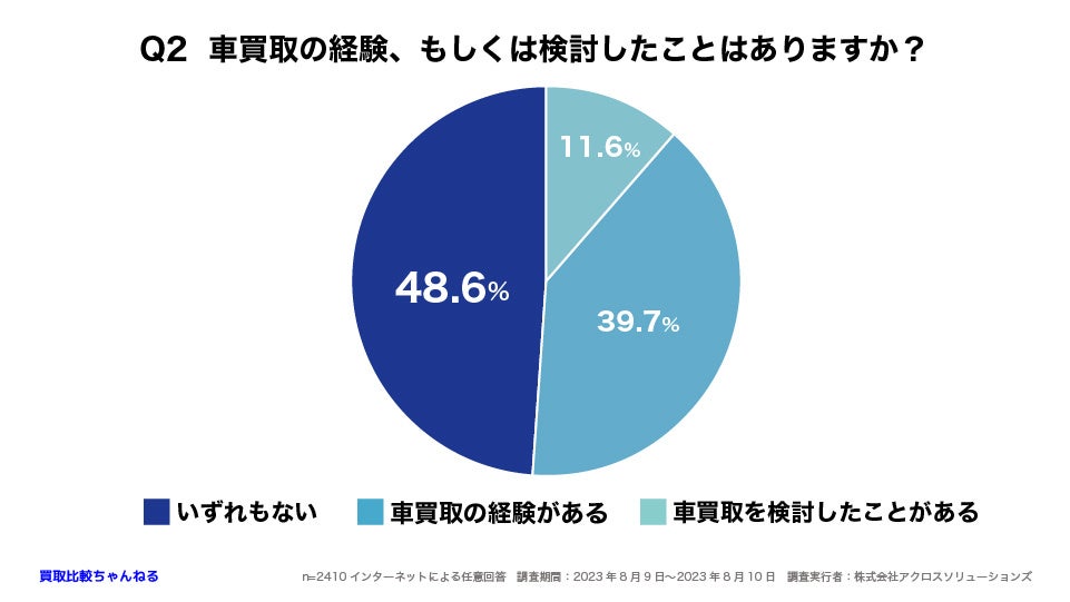 Q2 39.7%の人が車買取の経験があり、11.6%の人が車買取を検討したことがあると回答しました。