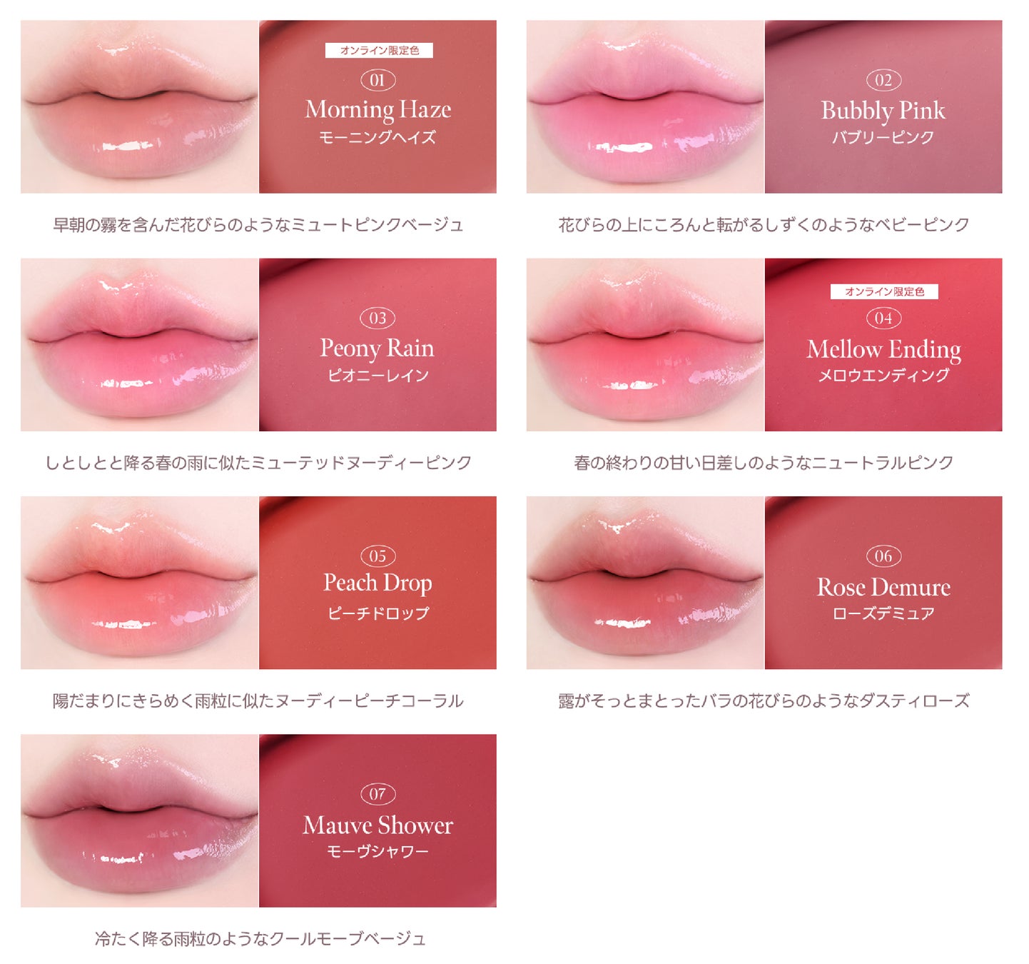 〈milktouch〉ツヤとうるおいをまとった #花雨グロス 日本限定色を含む全11色が、2/26より新発売!ベタつかず、軽やかなのにしっとりぷるぷるの仕上がりに。