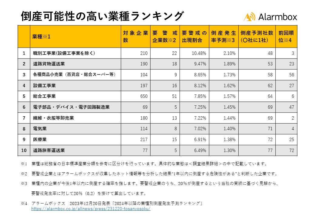 AI与信管理サービスを提供するアラームボックス株式会社(本社:東京都新宿区、代表取締役:武田浩和、以下「当社」)は、この度、2023年6月1日~2024年5月31日の期間に収集された14,058社・223,571件のネット情報等から1年以内に倒産する危険性がある“要警戒企業”を分析・抽出し、「倒産危険度の高い上位10業種」を予測しましたので発表します。