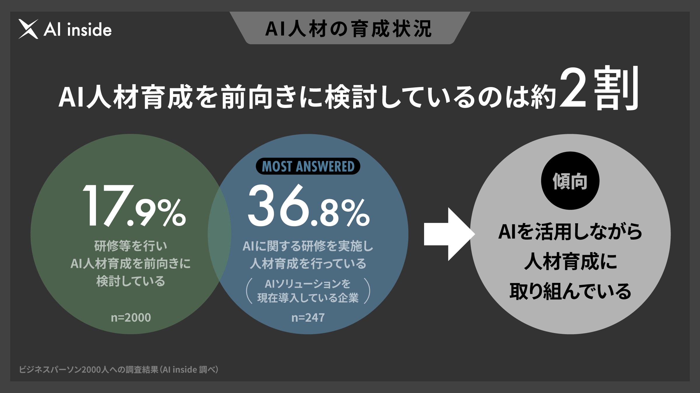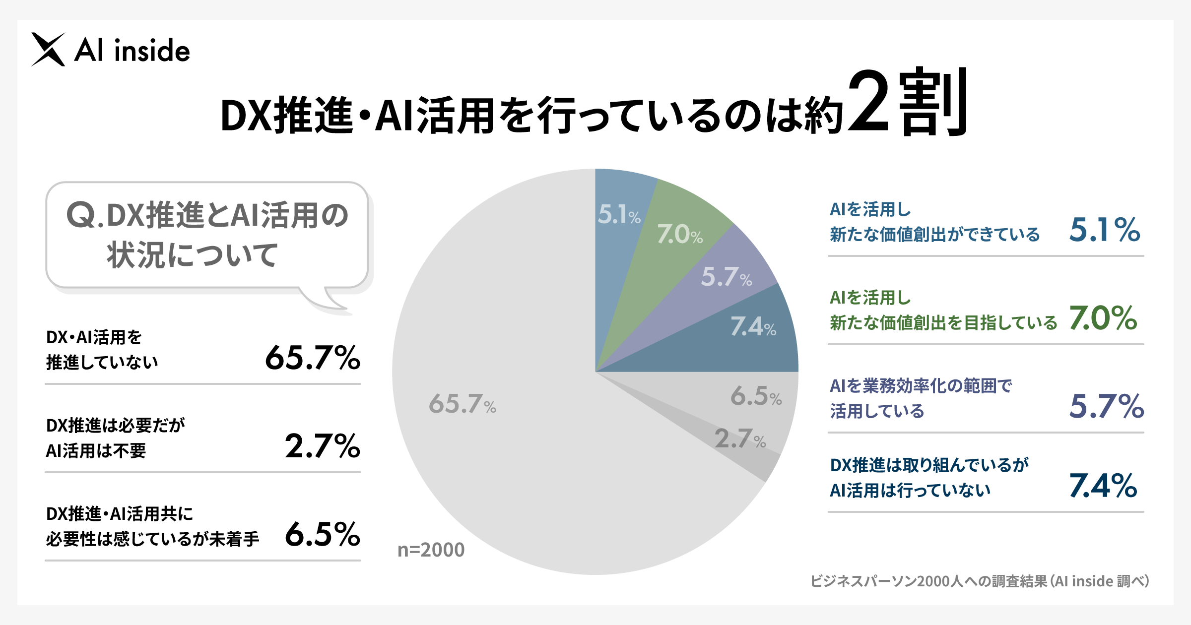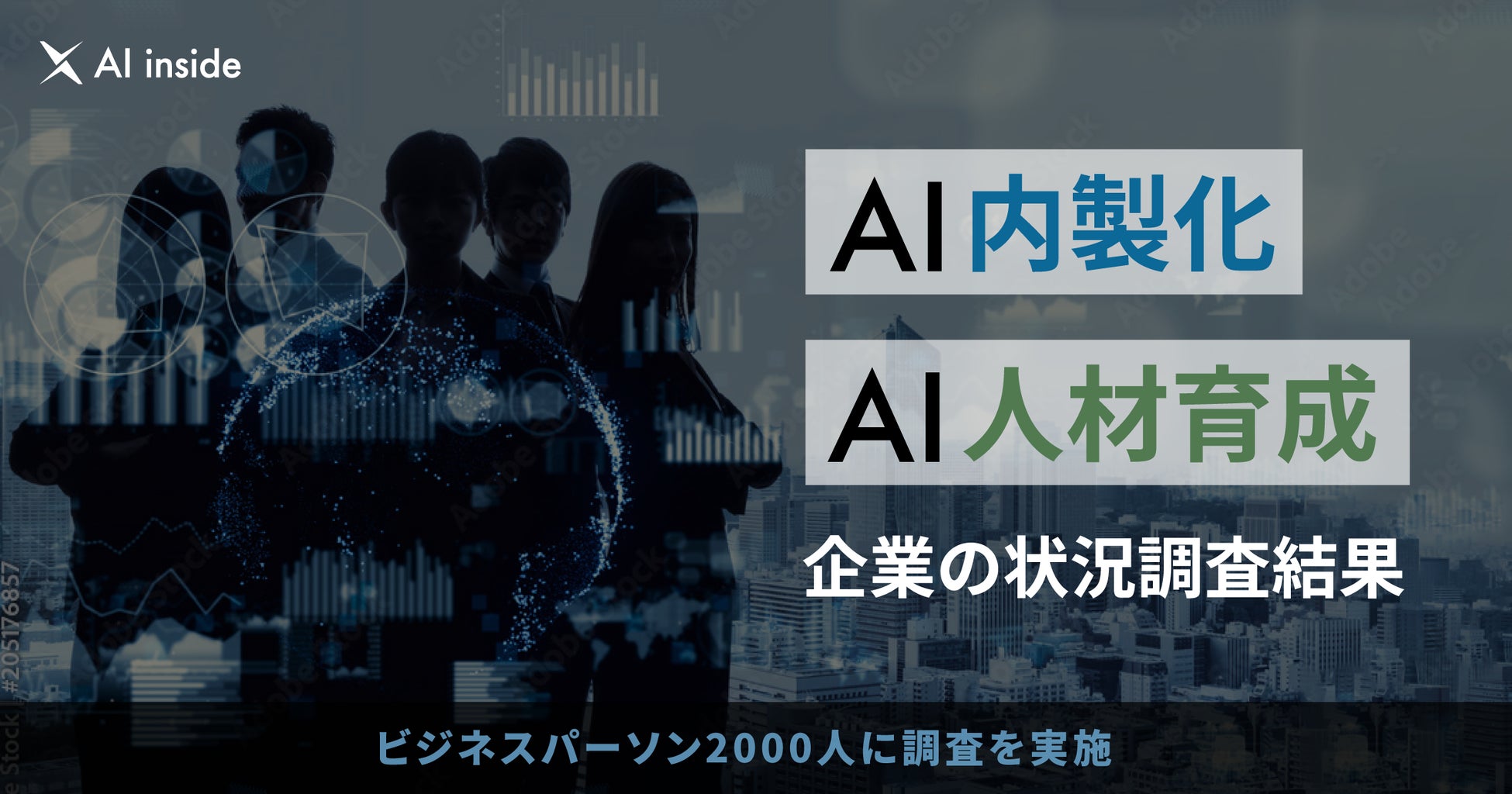AIプラットフォームを提供するAI inside 株式会社(代表取締役社長CEO:渡久地 択、本社:東京都渋谷区、以下「AI inside」)は、全国20〜50代のビジネスパーソン2,000名を対象に、所属している企業・団体でのDX推進に向けたAI活用・AIの内製化・AI人材の育成状況の把握を目的に調査を実施しました。
