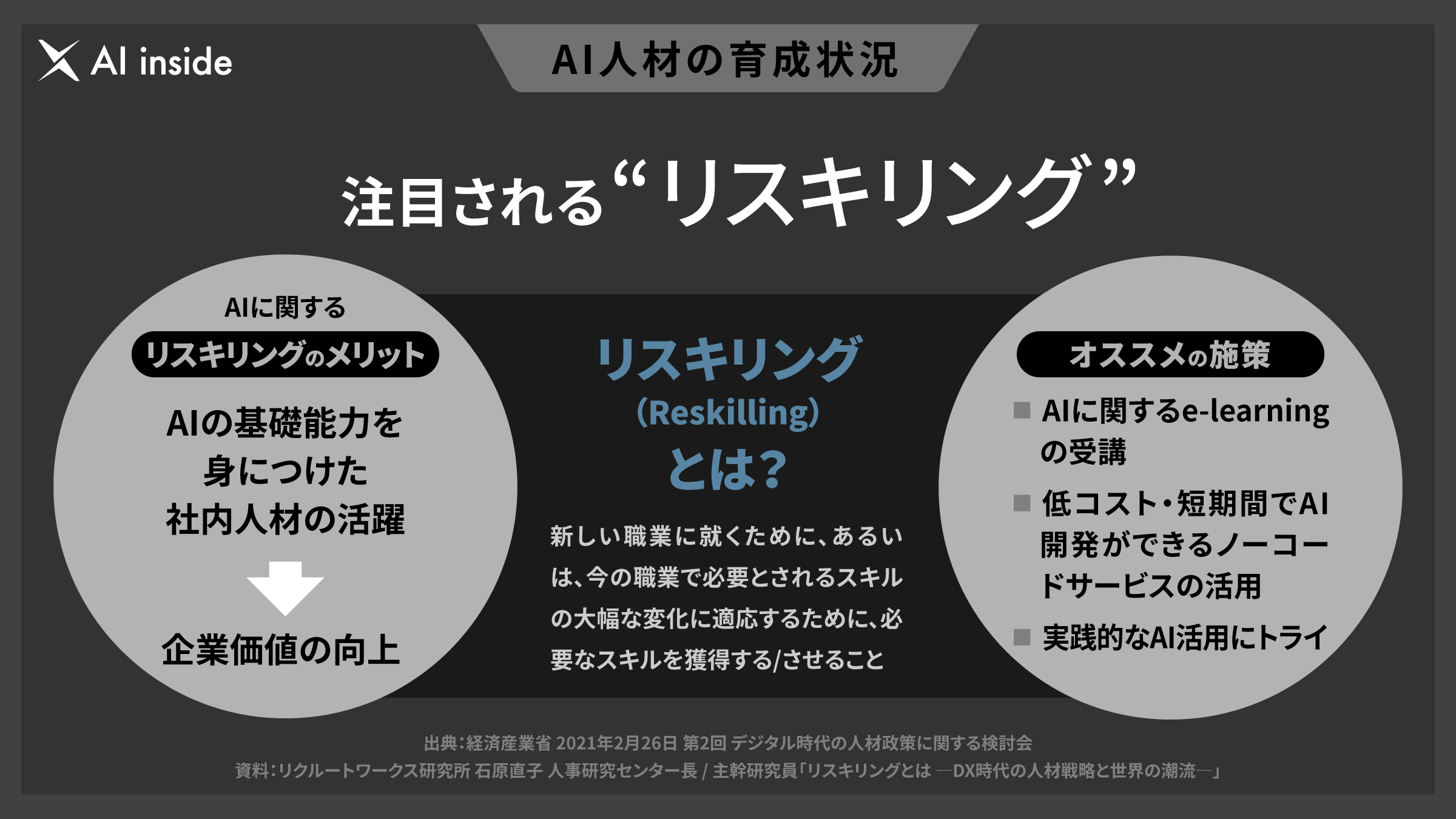 自治体によっては、AIの活用による生産性向上を目的に、企業におけるAI人材育成に対して支援補助金を出している場合もあり、AI人材育成を支援する動きは高まっています。AIにより新しい価値を生み出すためには、基本的なAIの基礎を学び、AIの具体的なイメージを持ちつつ、費用面と人材不足の課題をクリアすることで、導入速度や活用推進率が早まる可能性があります。