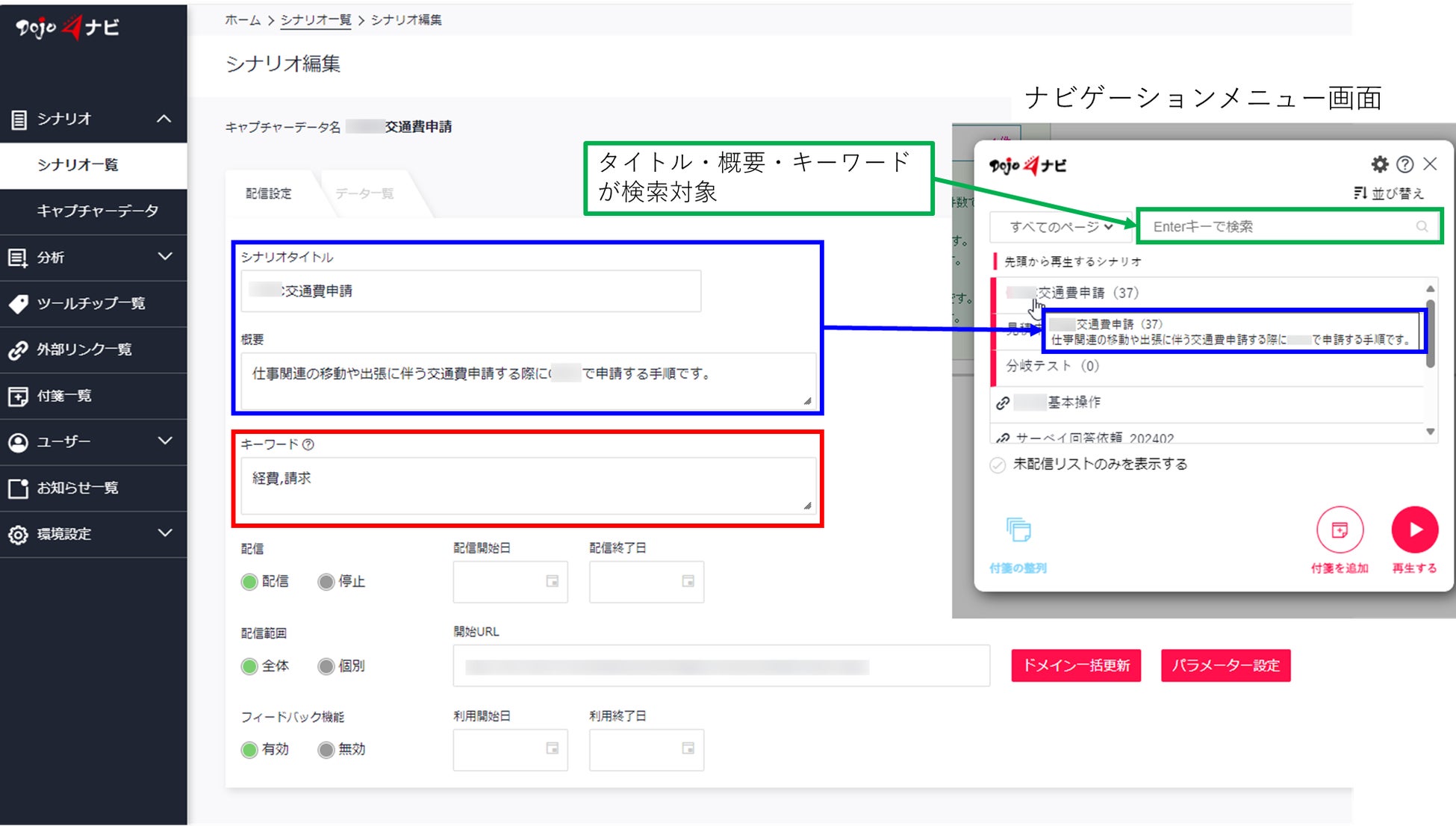 「概要」は、シナリオの内容を端的にまとめた文章を登録することができる機能です。ナビゲーションメニューのシナリオ選択時に、マウスオーバーするとツールチップ形式で表示されます。「キーワード」は、シナリオの検索性を高めるための機能です。シナリオのタイトル・概要・キーワードは、翻訳に対応し、ナビゲーションのメニュー画面における検索対象となります。