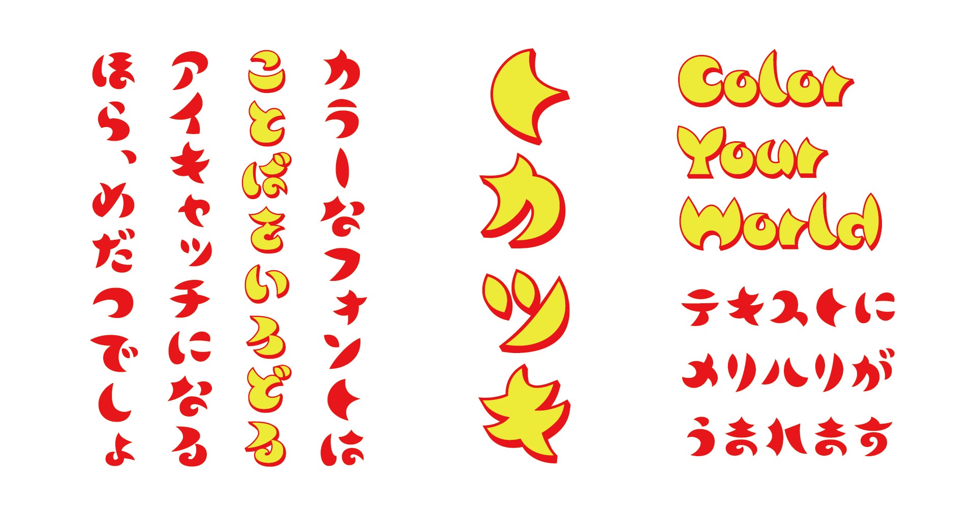 フォントワークス LETSでは、楽しい雰囲気を演出できるカラーフォント※MLトカツキ かな Colorも提供。赤と黄色の立体表現がポップで楽しい雰囲気を演出します。