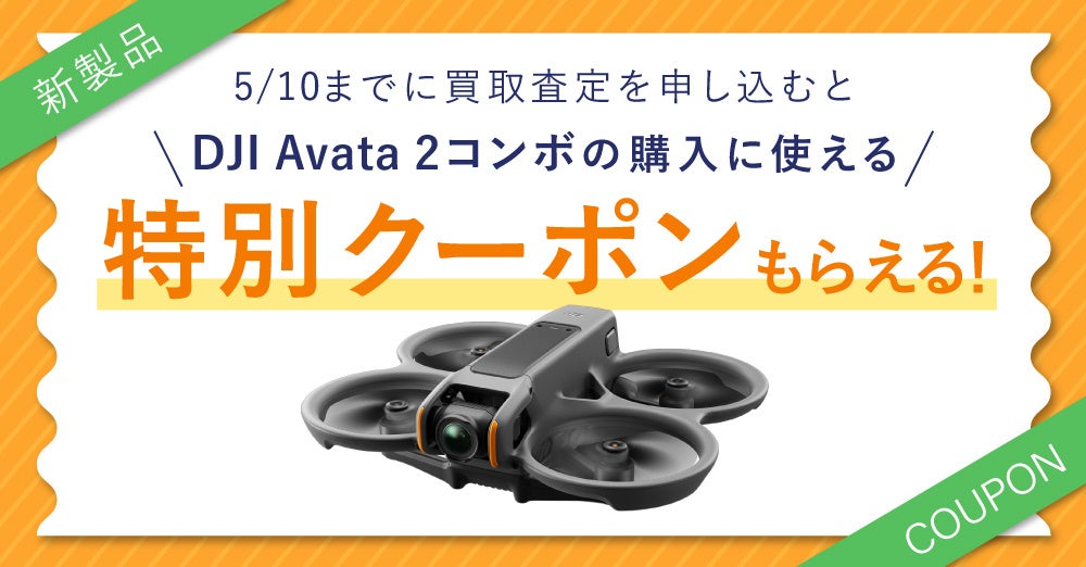 不要な機材はぜひシステムファイブまでお売りください。お手持ちのDJIドローンを買取査定にお申込みいただくと、「DJI Avata 2」購入時に使える特別クーポンをもれなくプレゼントいたします。さらに買取価格が通常よりも15%アップ!