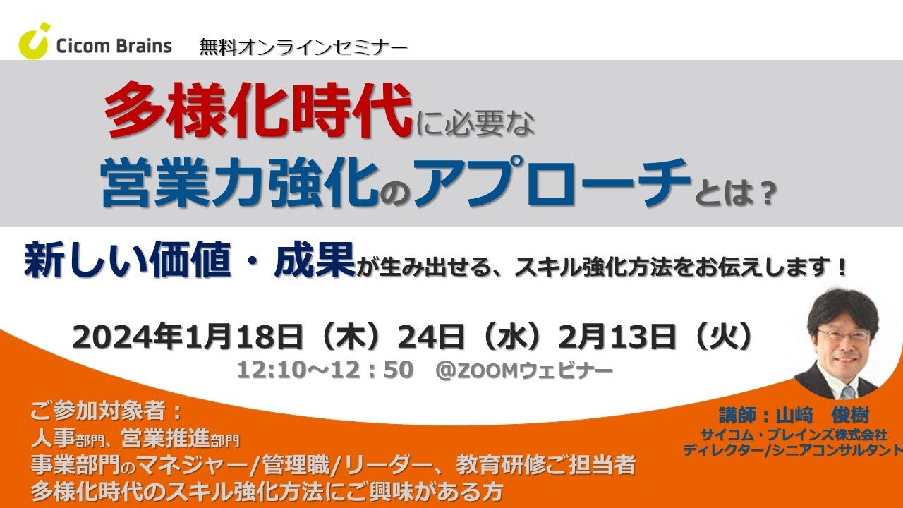 【多様化時代に必要な営業力強化のアプローチとは】~スキルレベルに合わせた実践型研修とフォローアップ~ サイコム・ブレインズのディレクター山﨑俊樹によるオンラインセミナーを1月18日他、全3回開催
