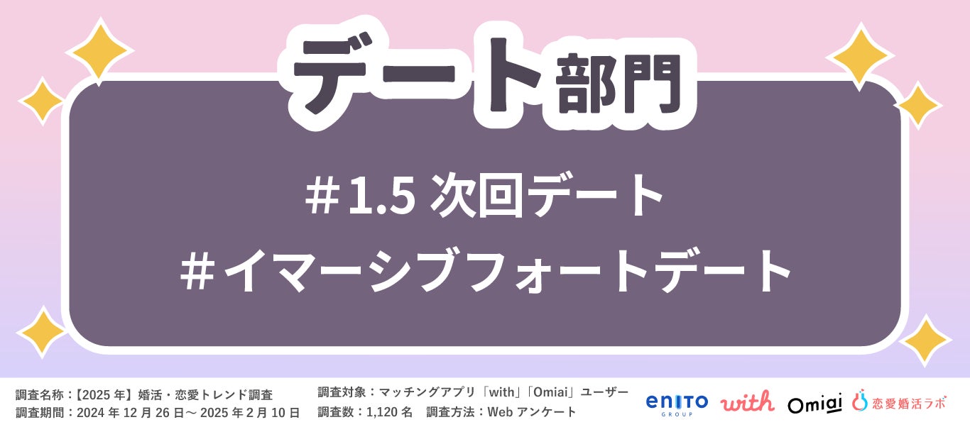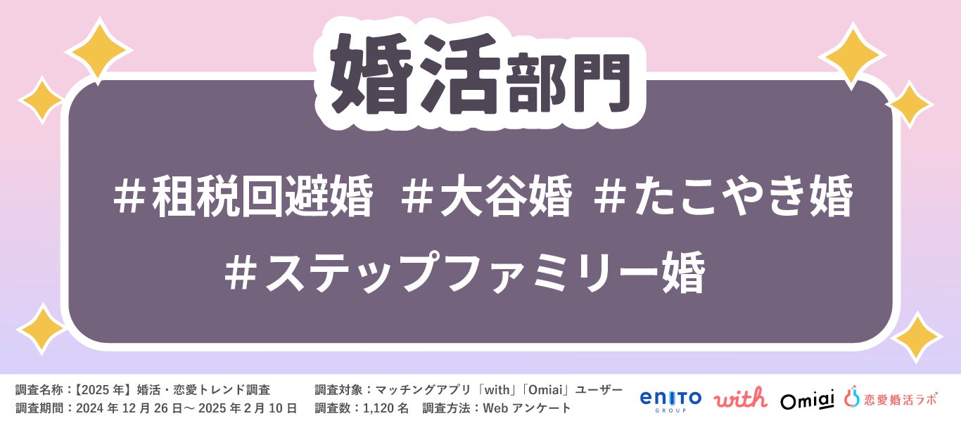株式会社Parasol(本社:東京都港区、代表取締役社長:伊藤早紀)が運営する未婚男女のマーケティング研究機関『恋愛婚活ラボ』は、株式会社エニトグループ傘下で、価値観重視の出会いを提供している利用者数No.1(※)のマッチングアプリ「with」を手掛ける株式会社with(東京都渋谷区、代表取締役CEO五十嵐昭人)と恋愛結婚を叶える「Omiai」を手がける株式会社Omiai(本社:東京都渋谷区、代表取締役CEO:今井良樹、以下当社)と共同で、「with」Omiai」を利用する男女へのアンケート・分析を行い、2025年の「恋愛・婚活のトレンド予測」を発表します。