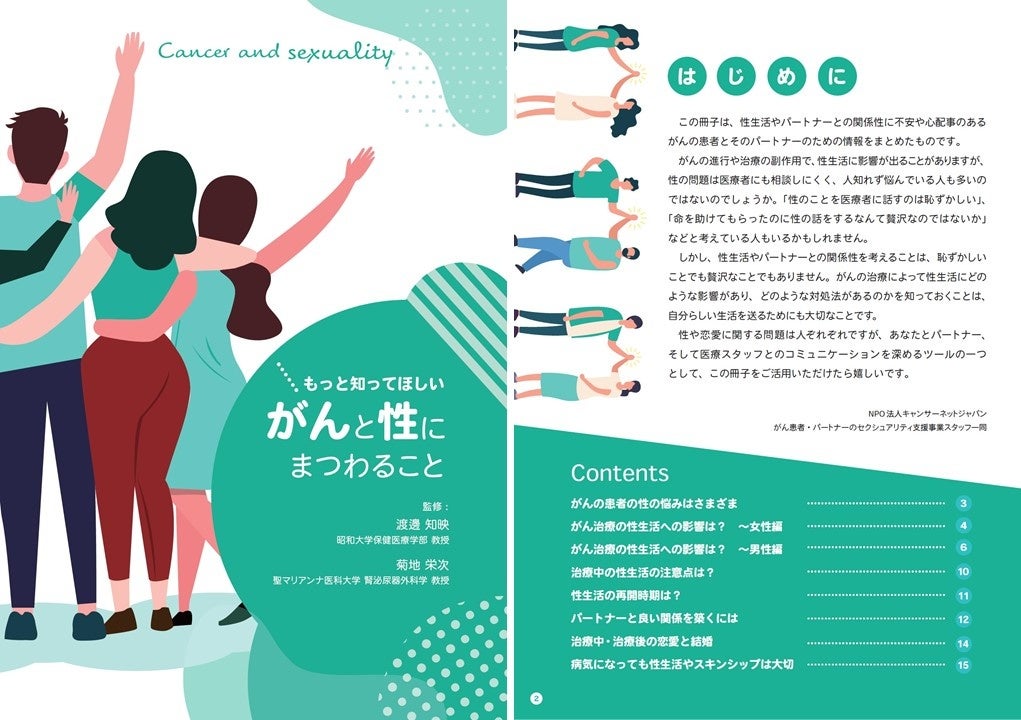 特定非営利活動法人キャンサーネットジャパン(以下、CNJ)は、がん患者やパートナーへがんや治療にともない変化・影響を及ぼす「性(セクシュアリティ)」にまつわる情報を提供するとともに、医療の現場における支援の一助となることを目的として、小冊子『もっと知ってほしいがんと性にまつわること』を制作しました。